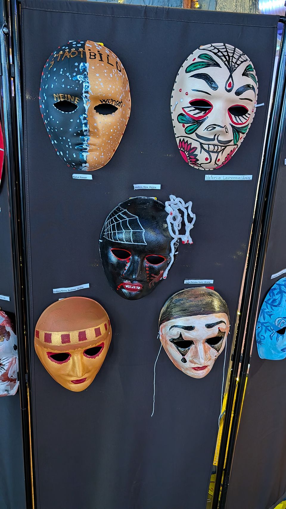 Zu sehen waren Bilder und maskenhafte Objekte, allesamt mit ganz unterschiedlichen Techniken gestaltet – mal fein und realistisch gemalt, mal gerakelt, dann wieder mithilfe einer Drucktechnik entstanden. So unterschiedlich wie die Techniken sind auch die Themen: „Zur Weihnachtszeit haben wir Orangen gemalt“, erzählte Nina Ivanova lachend. „Dieses positive Orange hat unsere Stimmung wiedergegeben.“