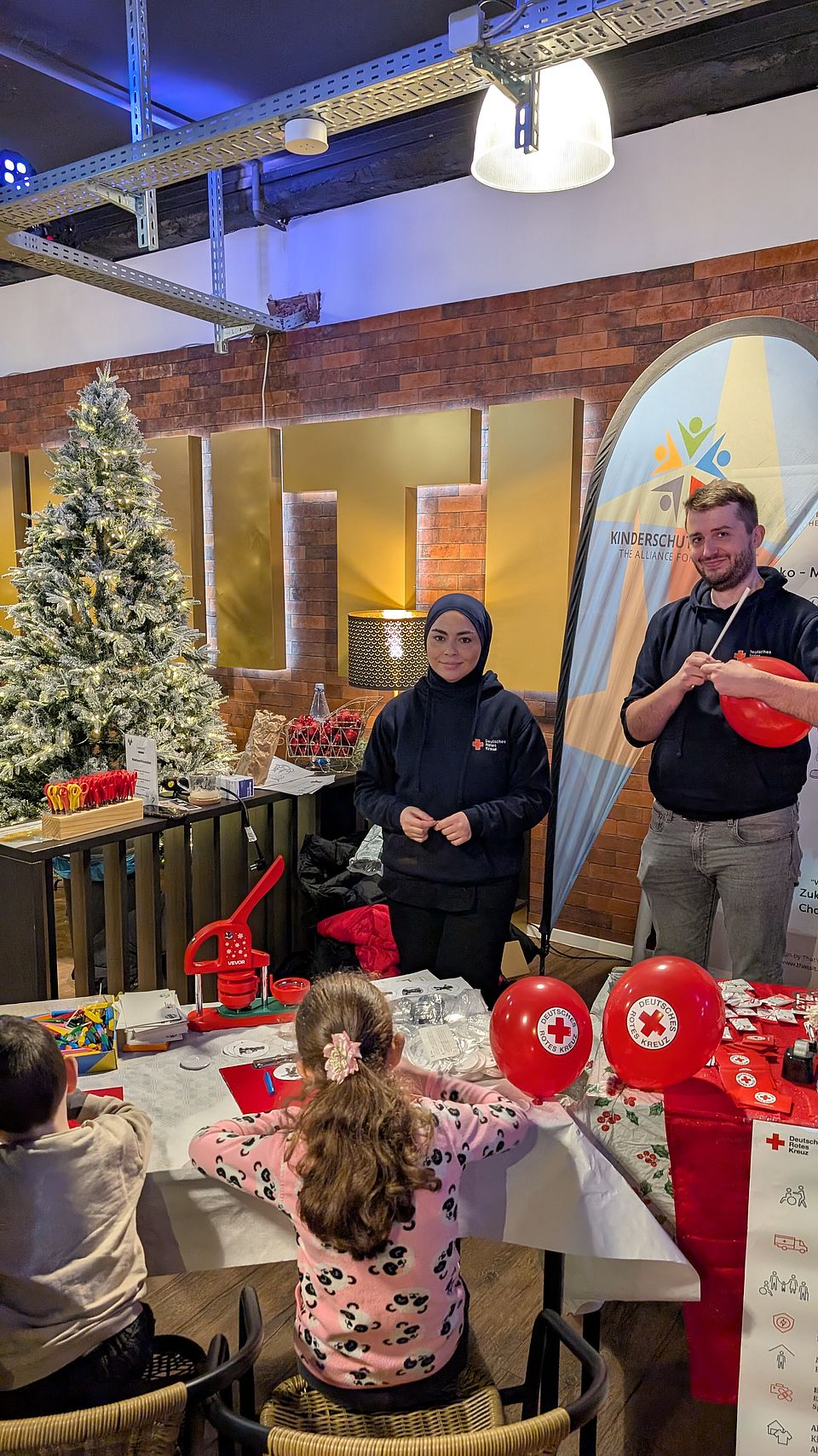Das DRK Gelsenkirchen vertrat bei dem Weihnachtsmarkt auch den Netzwerkpartner der Kinderschutzallianz, die ihrerseits schon viele Projektpartner in der Stadt gewinnen konnte. So auch die Gesamtschule Buer-Mitte, die Pilotschule ist für die Kinderschutzallianz und das Projekt „Sicherer Hafen“. Schülerinnen und Schüler der Einrichtung waren auch gekommen, um hier Plätzchen und Waffeln zu verkaufen. „Zur Aufbesserung der Klassenkasse“, verriet Lehrerin Stephanie Köster. Denn das ermögliche die Teilhabe aller an Gemeinschaftsaktionen und gleichzeitig schulen solche Aktionen die Selbstständigkeit und das Gemeinschaftsgefühl.
