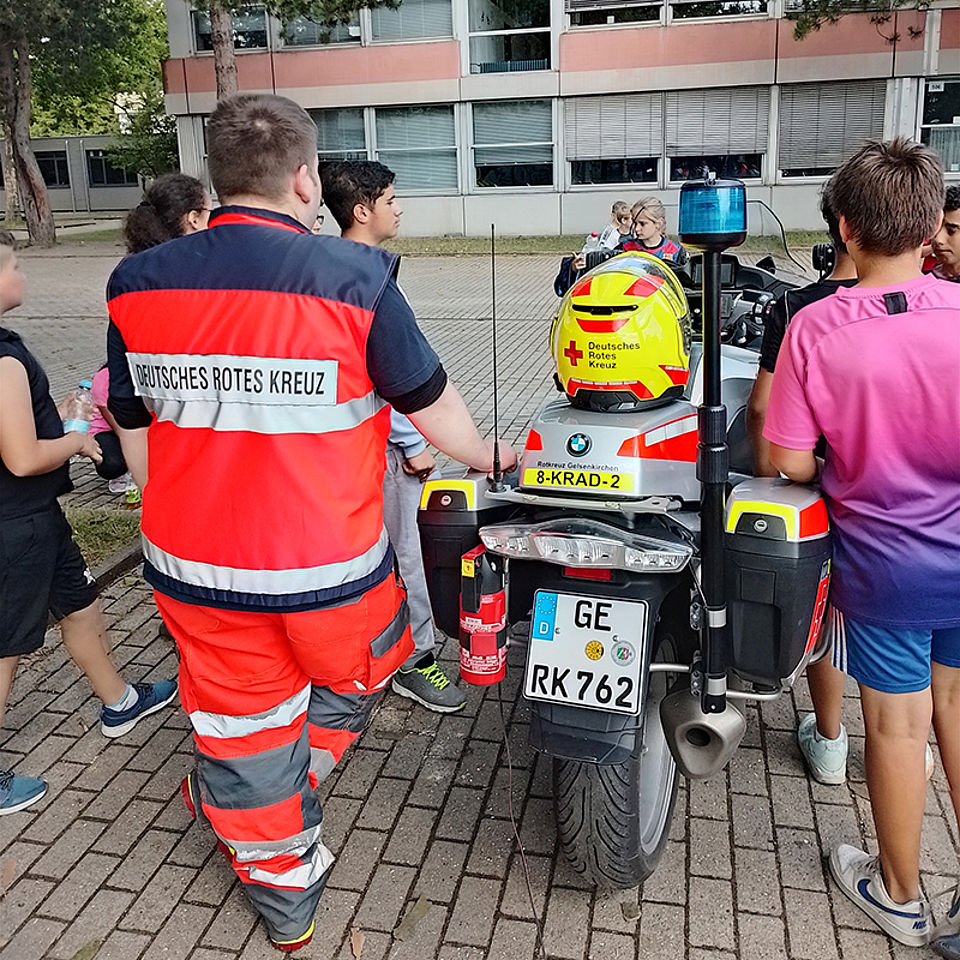 Darüber hinaus präsentierte sich der DRK Kreisverband Gelsenkirchen e.V. mit einem Informationsstand, an dem Interessierte mehr über die vielfältigen Aufgaben und Angebote des Deutschen Roten Kreuzes erfahren konnten. Ein besonderes Highlight für viele Besucher war zudem die Anwesenheit eines Motorrades unserer Motorradstaffel, das nicht nur beeindruckte, sondern auch die Bandbreite unserer Einsatzmöglichkeiten verdeutlichte.