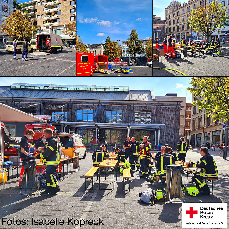 Der Marktplatz in Buer wurde zum Verpflegungszentrum als die 16 Einsatzkräfte des DRK Gelsenkirchen die rund 60 Männer und Frauen der Berufsfeuerwehr und der Freiwilligen Feuerwehr mit Warmverpflegung versorgten, die zuvor in der Küche im Katastrophenschutzzentrum zubereitet wurde. Die Helferinnen und Helfer reichten zusätzlich Getränke und Süßigkeiten zur Stärkung.
