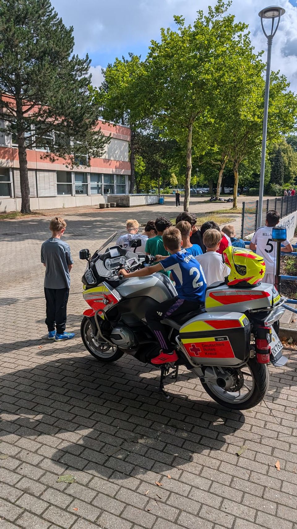 Hier und heute erfahren die Schülerinnen und Schüler aller Jahrgänge erstmals mehr über das umfangreiche Angebot im Rettungsdienst des DRK. Besonders spannend: Auf dem Hof steht ein Rettungswagen, der besichtigt werden darf und wo sich die jungen Menschen verbinden lassen können. Noch interessanter aber ist für viele das Motorrad aus der Motorradstaffel des DRK, mit dem Dominik Wittkamp heute hier ist. Die Jugendlichen sind begeistert, nehmen allzu gern die Möglichkeit wahr, einmal Probe zu sitzen und diesen Moment mit einem Foto festzuhalten. „Es hat ein wenig gedauert, bis sich der erste getraut hat. Aber jetzt wird das sehr gut angenommen“, so Dominik Wittkamp, der Probleme hat, überhaupt vom Hof zu kommen, als er zum nächsten Einsatz muss.