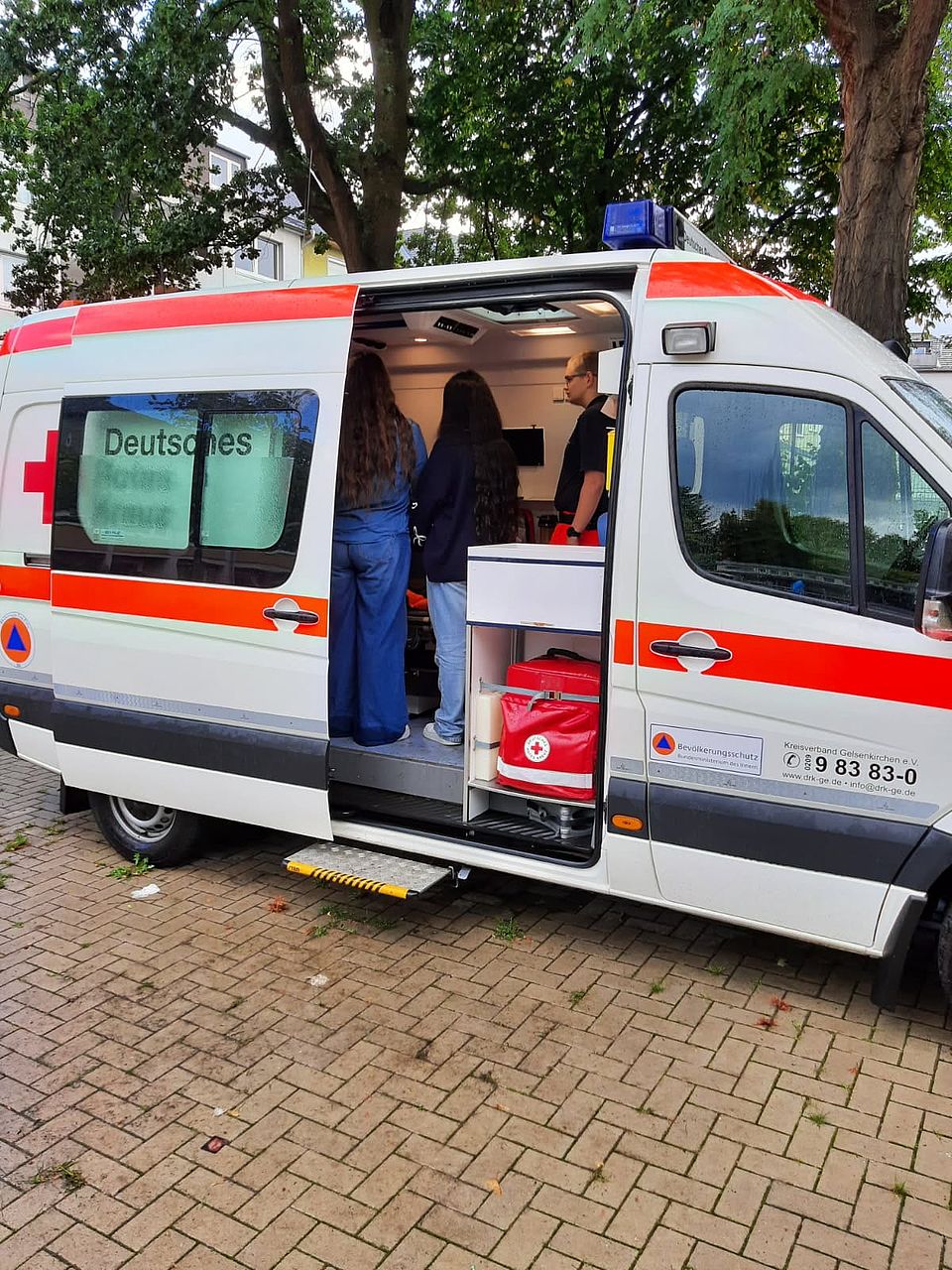 Derweil erklärt Michael Mrowietz in einem Klassenzimmer Xheni und ihren Freundinnen weiter, welche beruflichen Perspektiven das DRK bietet, dass man mit einem Hauptschulabschluss gleich die Rettungshelfer-Ausbildung machen und einsteigen kann. Die jungen Damen saugen die Informationen förmlich auf. „Das ist für mich auch beruflich interessant“, sagt Xheni, die ganz klar formuliert, ihr Herzenswunsch wäre es, anderen helfen zu können. Das will auch Anastasia. Die Elfjährige will sich ebenso melden für den Schulsanitätsdienst. „Weil ich es wirklich mag, Menschen zu helfen.“ Dann ziehen die Mädchen weiter. Ihre letzte Station für heute ist ein Besuch im Rettungswagen. Bald, sagt Michael Mrowietz, werde die Ausbildung beginnen. „Und schon zum Winter hat die Hauptschule an der Grillostraße ihren eigenen Schulsanitätsdienst.“