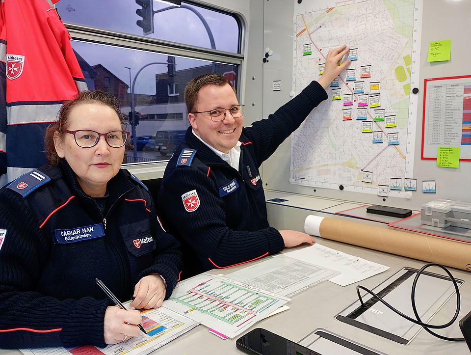 „Wir haben 19 Rettungswagen und Krankentransportwagen im Einsatz und dazu drei Motorräder“, erklärt Nils Schulz. Er ist, verrät er, selbst organisierter Jeck und stößt von den Maltesern zur Truppe. Letzteres trifft auch auf Dagmar Man zu, die gemeinsam mit ihm dem Einsatzleiter zuarbeitet. „In analogen Zeiten schob man die Wagen per Hand über die Karte. In der digitalen Version geht es natürlich schneller. Das ist schon eine Erleichterung. Aber wir dokumentieren immer alles auf beide Weisen. Wir sind ja Katastrophenschützer, wir rechnen immer mit dem Schlimmsten.“ Also auch mit einem Stromausfall. Und man müsse ja dennoch weiter arbeiten können.