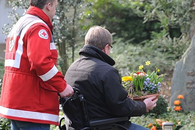 Die ehrenamtlichen und freiwilligen Mitarbeiter des DRK holen Friedhofsbesucher zu Hause mit einem Fahrzeug ab und nehmen bei Bedarf den Rollator oder Rollstuhl mit.