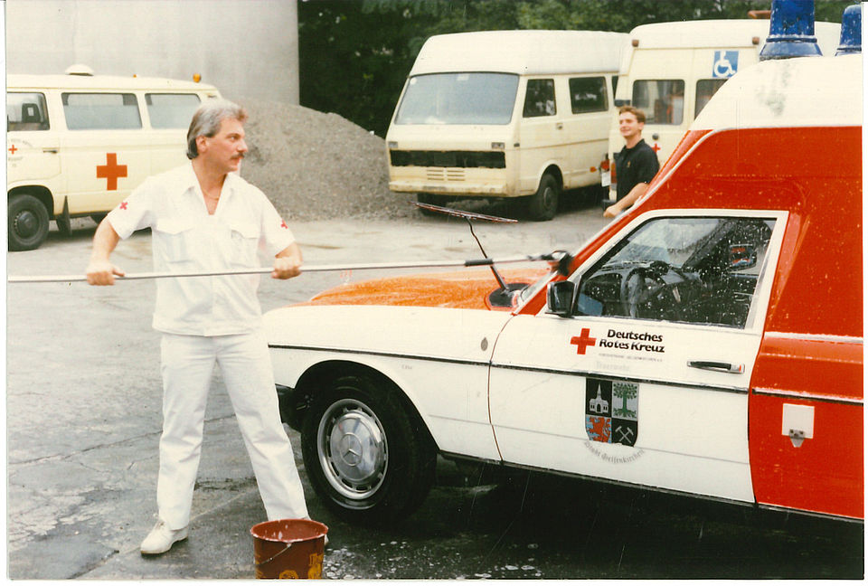 In einem historischen Moment nimmt er 1980 seine hauptamtliche Tätigkeit für das DRK auf: „Damals haben wir den ersten Rettungswagen bei der Stadt übernommen, der nur mit DRK-Personal bestückt war. Wir waren zu dritt, alle eingestellt für den Krankenwagen auf der Feuerwache 3 im Emscherbruch.“