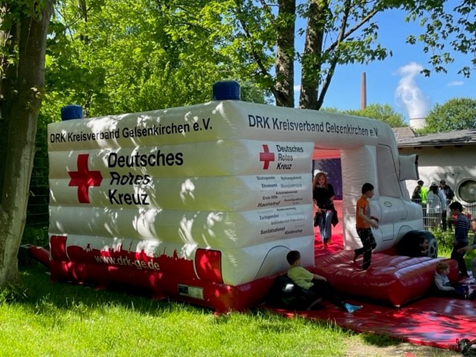 Rotkreuzbegründer Henry Dunant kam vor 194 Jahren auf die Welt und das DRK in NRW sorgt zum Geburtstag für Kaffee und Kuchen. Ob in den Verbandsgebieten der DRK-Kreisverbände oder im Landtag in Düsseldorf schenkten Rotkreuzlerinnen und Rotkreuzler nach langer Corona-Pause wieder Kaffee aus. Das Motto: „Wir sind bei jedem Hilferuf hellwach – und zum Weltrotkreuztag am 8. Mai geben wir einen aus!“. Auch der DRK-Kreisverband Gelsenkirchen e.V. beteiligte sich an der Aktion. Auf dem Schulhof der Mehringschule wurden alle ukrainischen Bewohner der städtischen Unterkünfte zu Kaffee, Kuche und frisch Gegrilltem eingeladen. Neben dem leiblichen Wohl boten Hüpfburg und Torwandschiessen eine willkommene Abwechslung. Bei sommerlichem Wetter genossen insbesondere die Kinder das kleine DRK-Fest.