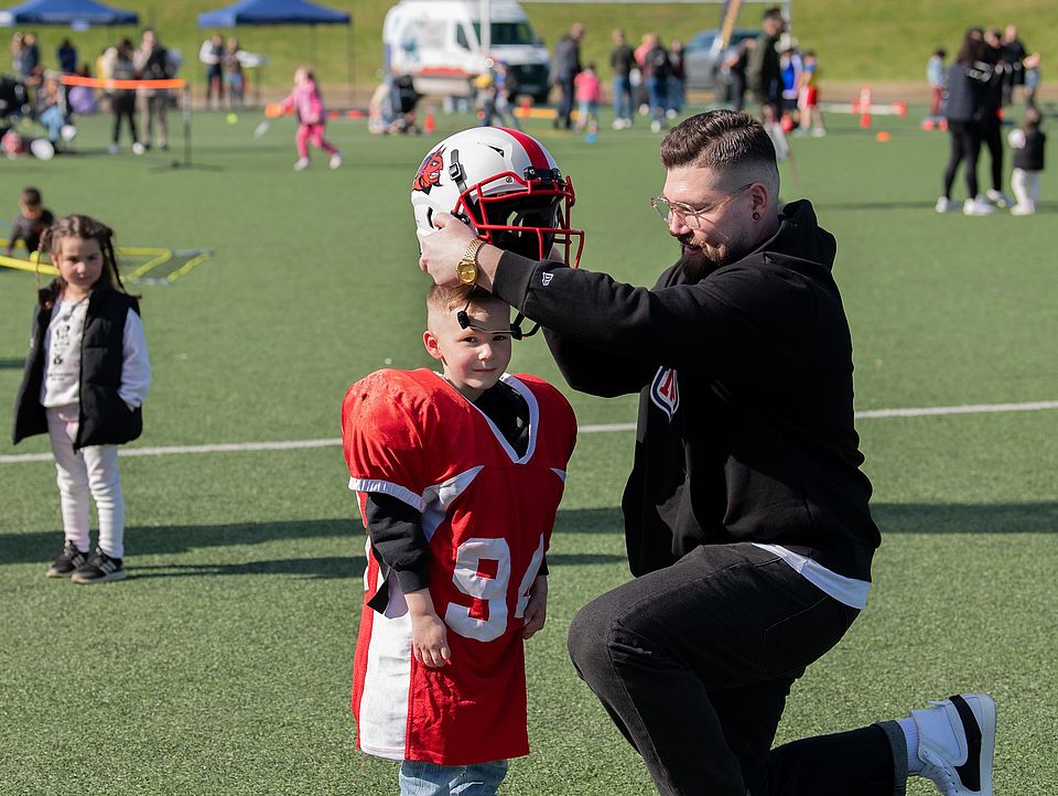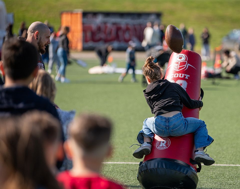 Wenige Meter daneben haben sich die „Gelsenkirchen Devils“ positioniert. Der örtliche Football-Verein hat mehrere Stationen aufgebaut. An einem Wurfnetz probieren Kinder und vielfach Jugendliche, wie man das Ei richtig wirft. An der zweiten Station lernen sie das „Tackling“, also wie man sich am besten mit vollem Körpereinsatz dem Gegner entgegenwirft und ihn zu Fall bringt. Besonders spektakulär: Eine Wurfmaschine. In die legt man den Football ein, der dann automatisch recht weit fliegt. So lernen angehende Spieler das richtige Fangen. „Dann braucht man nicht immer den Quarterback, um den Ball zu werfen“, erklärt Johannes Werner, Vorstandsmitglied der „Devils“. Er erklärt, „sein“ Sport sei im Kommen, wecke immer mehr Interesse. „Auch wenn Gelsenkirchen natürlich eine Fußballstadt ist.“
