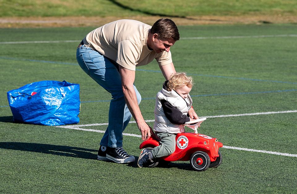 Das klappt. Jede Station ist besetzt. An einigen stehen die kleinen Besucherinnen und Besucher sogar geduldig in der Schlange. Je nach Alter sind ganz unterschiedliche Angebote attraktiv. Insbesondere ganz junge Herren flitzten begeistert auf roten DRK-Bobbycars über das Grün des Kunstrasens. „Eigentlich hatten wir noch einige Hindernisse mehr aufbauen wollen. Aber wegen des Windes geht das nicht. Jetzt stehen hier nur die Verkehrsampeln, auf die die Kinder achten müssen. Da haben sie großen Spaß dran“, erzählt DRK-Mitarbeiterin Ziynet Gülbasti. Erst danach erkennen die großen Gäste, was die kleinen schon verinnerlicht haben: Die Ampeln funktionieren tatsächlich. Und natürlich dürfen die Kinder nur fahren, wenn das grüne Licht leuchtet.