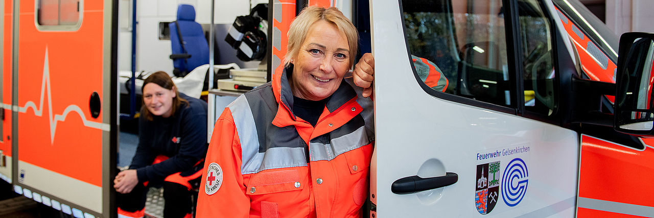 Meike Schiller und Stefanie Bruns haben ganz unterschiedliche berufliche Lebensläufe. Sie verdeutlichen, wie facettenreich die Einstiegsmöglichkeiten in den Rettungsdienst beim DRK sind. “Ich bin mit 55 Jahren die älteste hauptamtliche Sanitäterin im DRK”, erzählt Meike Schiller. Sie ist auf dem zweiten Bildungsweg Lebensretterin geworden. “Ich habe erst eine Ausbildung zur Schneiderin gemacht bei einem Tochterunternehmen von Steilmann.” Später füllt sie ihre Tätigkeit als Hausfrau und Mutter ganz aus.